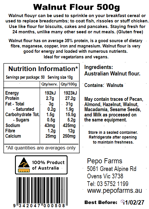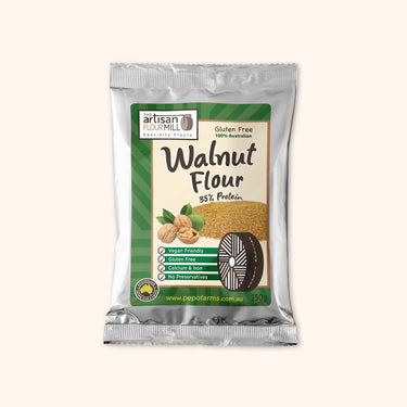 Made from walnuts grown in Victoria’s High Country and the Riverina NSW, our walnut flour is pressed for oil and finely milled for a delicate, nutrient-rich result. Naturally gluten-free, high in protein and essential minerals, it brings a subtle sweetness and nutty richness to baking and savoury crusts. Perfect for cakes, tarts, or as a nourishing base in gluten-free recipes. Crafted in Ovens, VIC with minimal waste—every walnut used to its fullest flavour and nutritional potential.