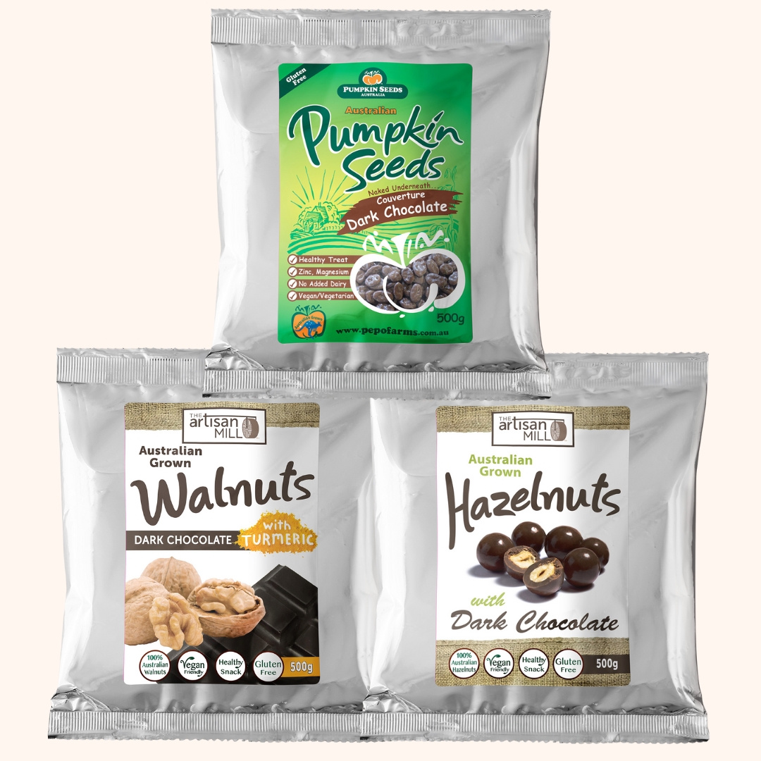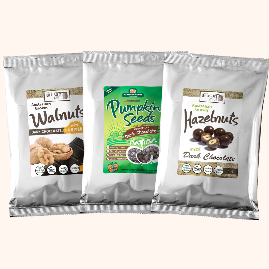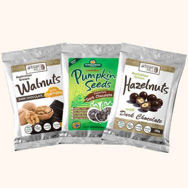 Chocolate-Coated Pumpkin Seeds – our signature crunchy, nutritious and lightly toasted seeds layered in premium Belgian-style chocolate.