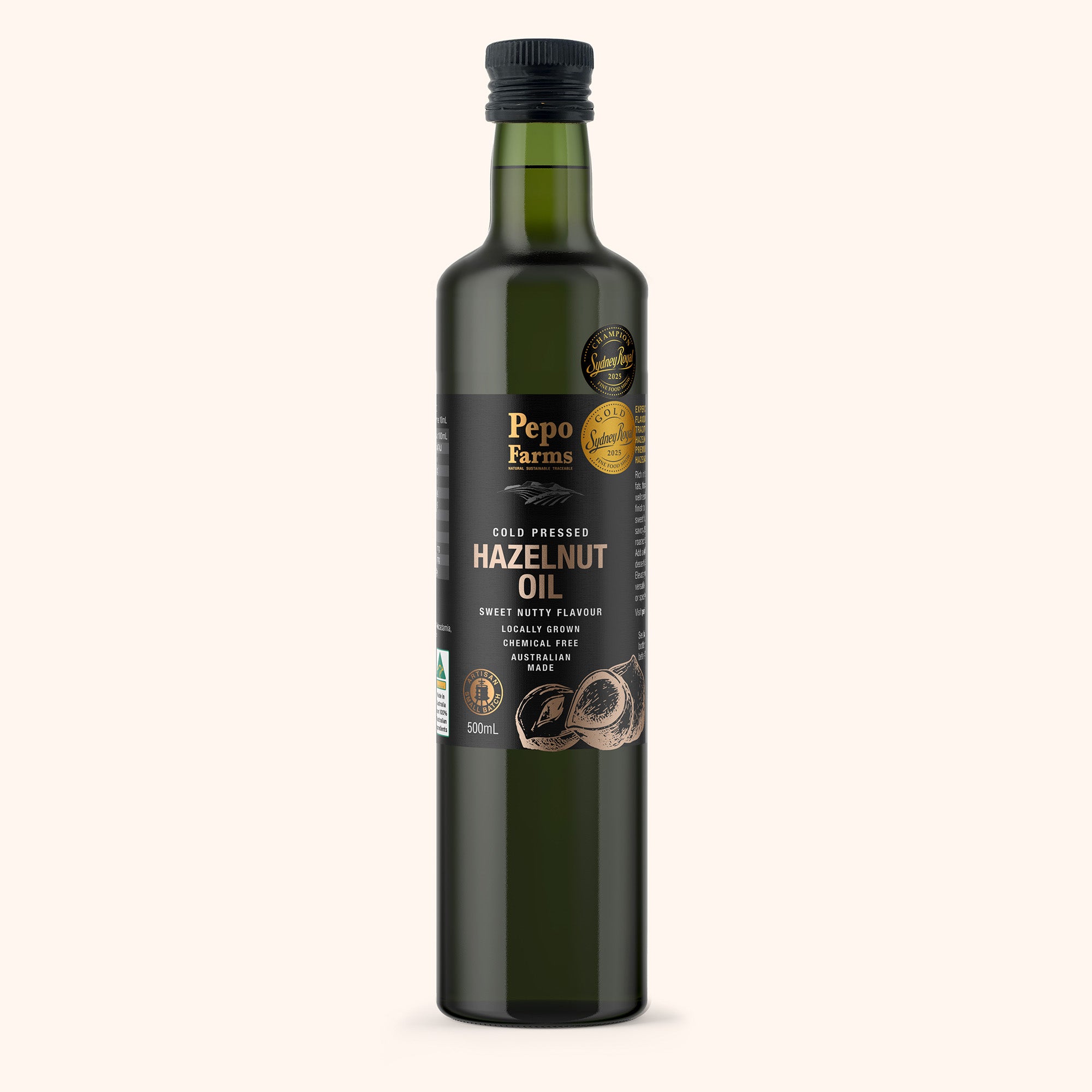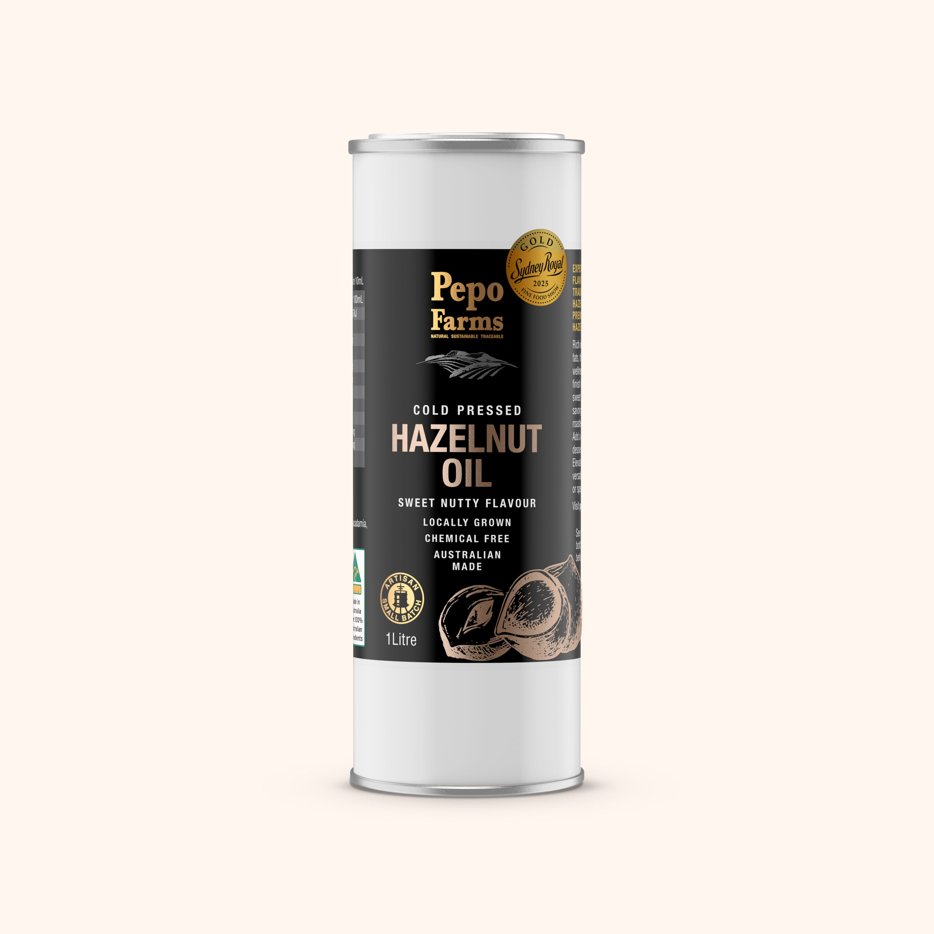 Cold-pressed from premium hazelnuts grown exclusively in Myrtleford, Stanley and Mitta Mitta, Victoria’s High Country. Our Hazelnut Oil is silky, aromatic, and naturally rich in omega-9 monounsaturated fatty acids, supporting cardiovascular function. Its lightly sweet, nutty profile pairs beautifully with roasted vegetables, chocolate desserts, or fresh fruit. Handcrafted in Ovens, VIC, it complements our roasted hazelnuts and hazelnut flour in a true wholefood system.
