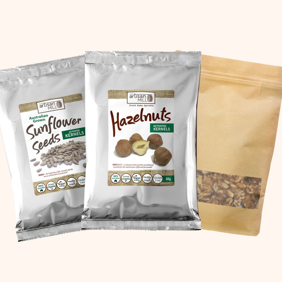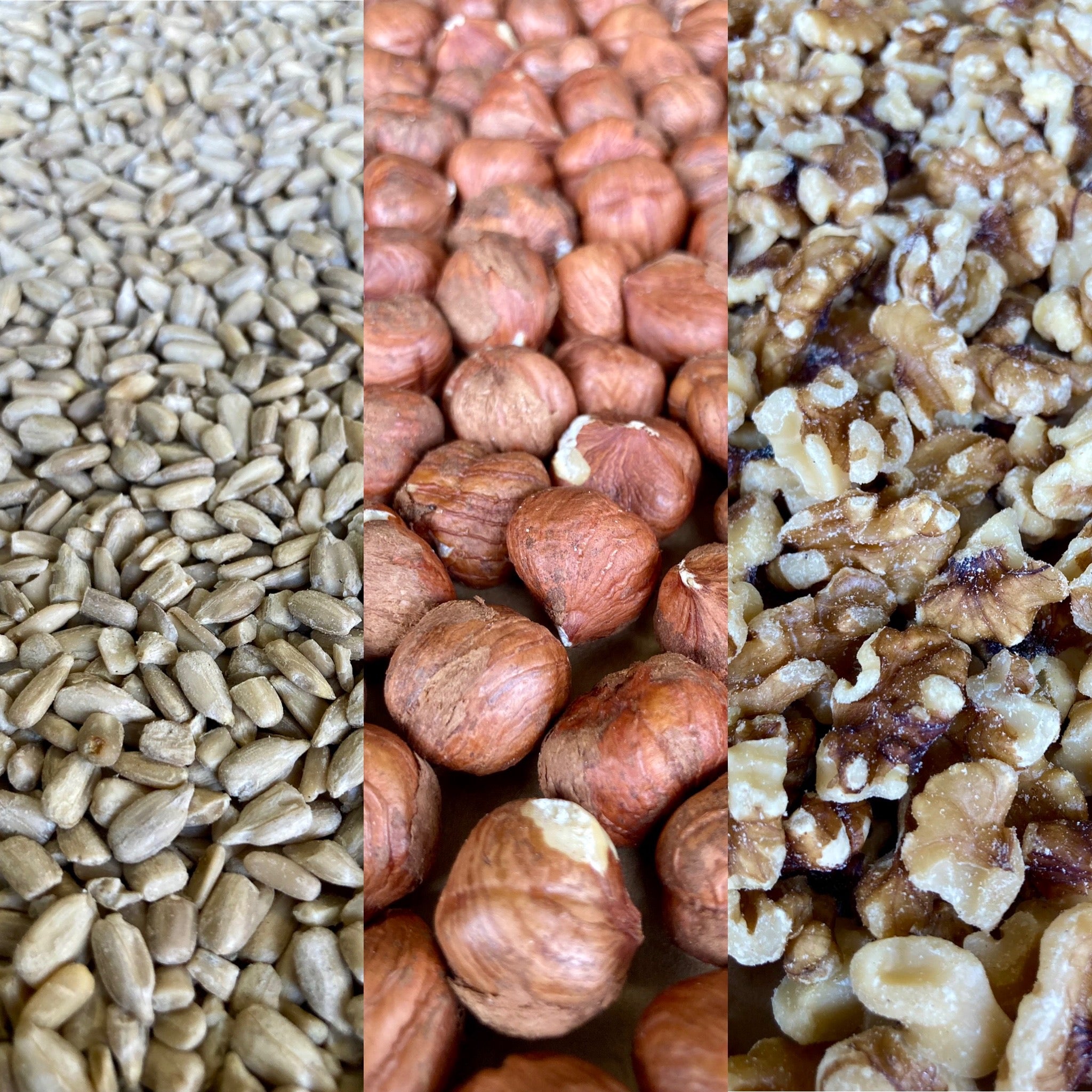 Large: 1x 1Kg Sunflower seeds, 1x 1Kg Raw Hazelnuts, 1x 850g Walnut kernels