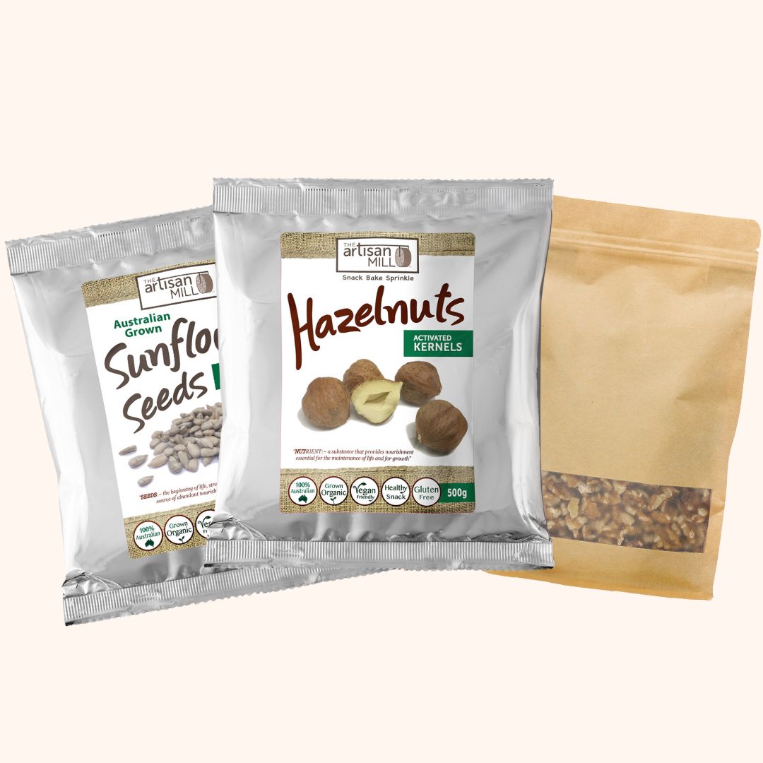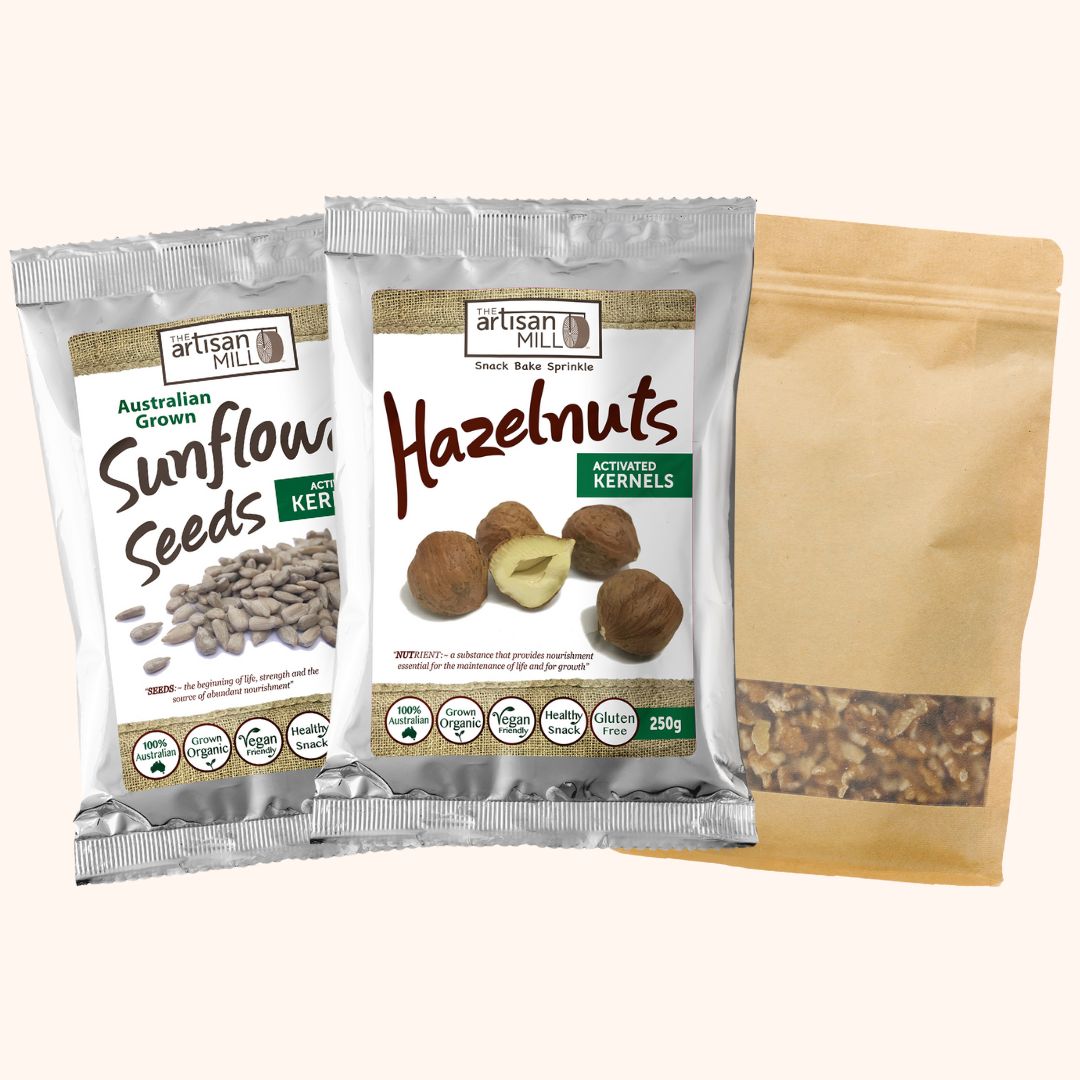 Small: 1x 250g Sunflower seeds, 1x 250g Raw Hazelnuts, 1x 375g Walnut kernels