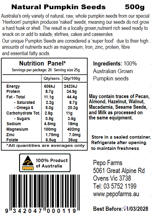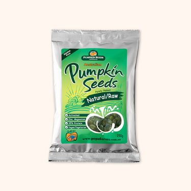 The only Australian-grown heirloom pumpkin seeds, cultivated in the Ovens Valley of North East Victoria. Unlike imported pepitas, our seeds are fresher, nutritionally denser, and full of rich, nutty flavour. Naturally high in protein, zinc, and magnesium, they are a true superfood. Enjoy them raw as a snack, sprinkled over salads and breakfast bowls, or blended into smoothies. Handcrafted in our Ovens, VIC facility with minimal processing to preserve their nutrient integrity.