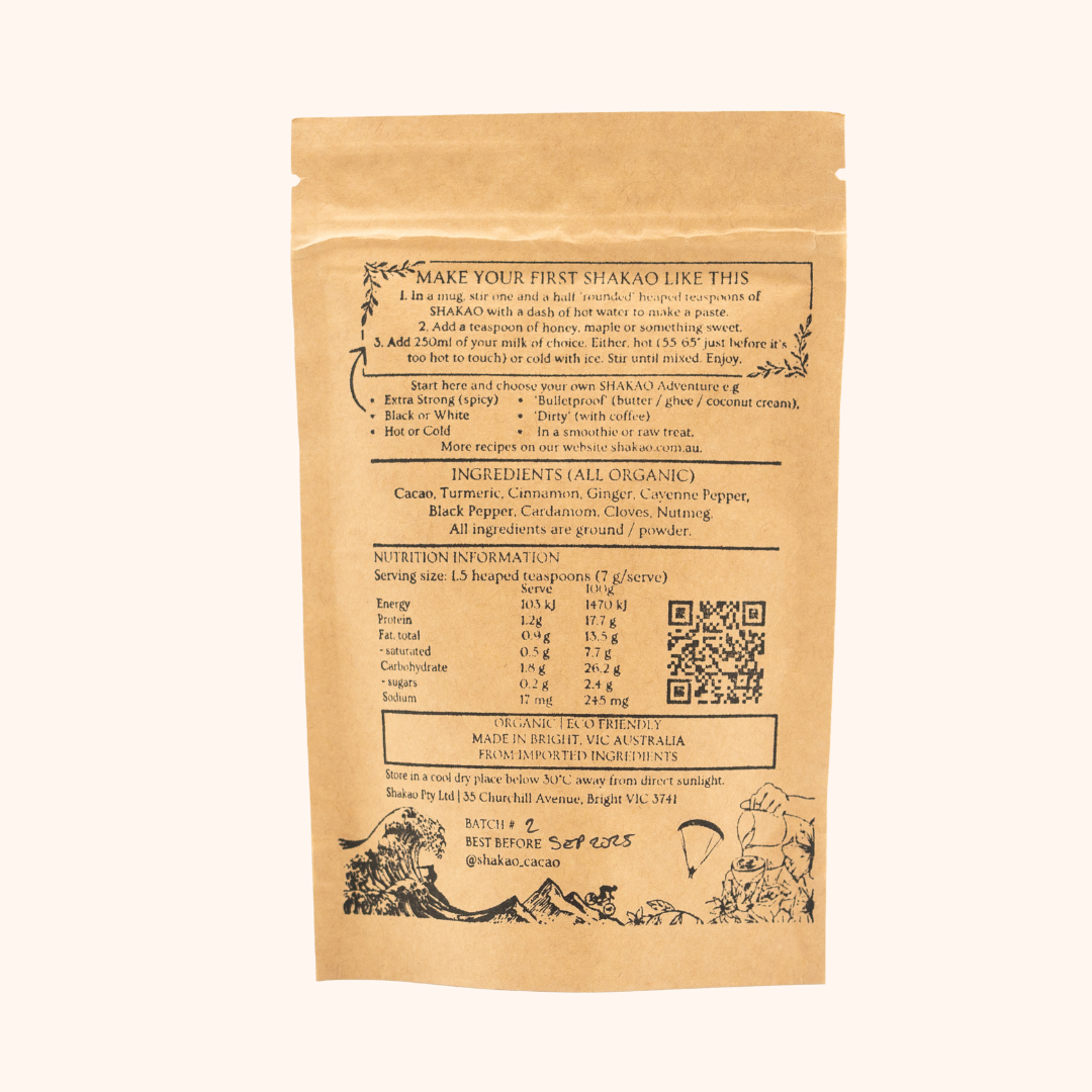 Discover Shakao - Spiced Cacao mix, your new feel-good ritual! This healthful "Adult" hot chocolate blends organic high-magnesium cacao with warming spices like turmeric, cinnamon, ginger, and a hint of cayenne. Inspired by ocean breezes and mountain air this new local product is created by local adventurer and friend of Pepo's Stan Meissner. It’s perfect hot with your favourite milk in winter or chilled over ice in summer. Get creative by adding it to bliss balls or baked treats for a spicy twist. Crafted with love by local adventurer Stan, it’s a delicious way to spice up your day!