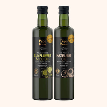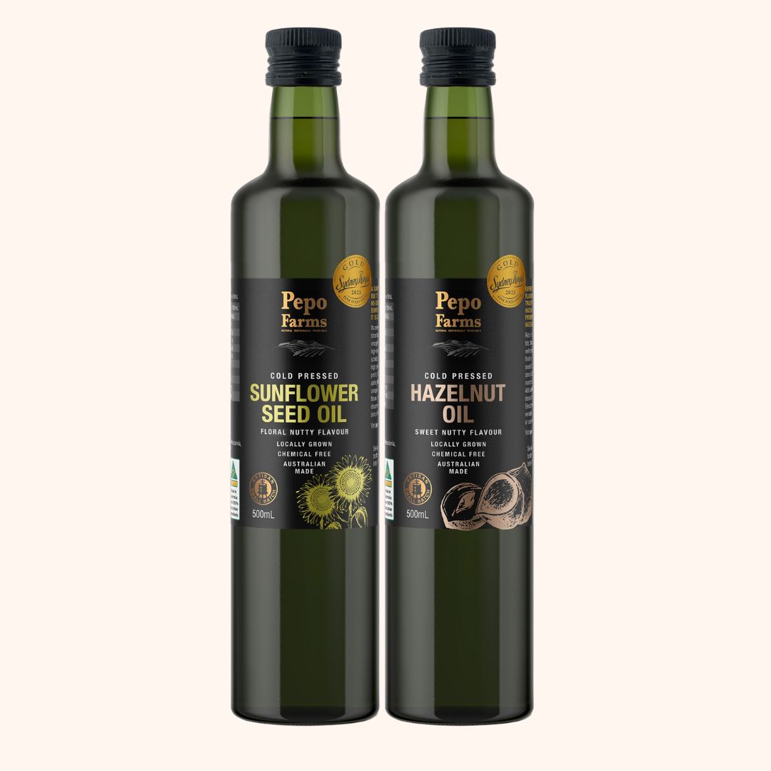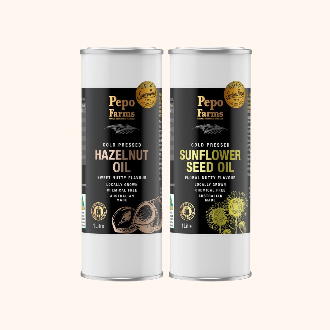 Bring a golden glow to your kitchen with our award-winning Sunny & Nutty Duo. This pairing of Pepo Farms’ Gold Medal Sunflower Oil and Champion Hazelnut Oil is proof that flavour and nutrition go hand-in-hand. Sunflower oil shines with its light, versatile character—perfect for roasting vegetables, sautéing leafy greens, and adding a dose of vitamin E and antioxidants. Hazelnut oil brings a silky, nutty richness that elevates both savoury and sweet dishes—think buttery mashed potatoes, seasonal salads, or a drizzle over ice cream and fruit.